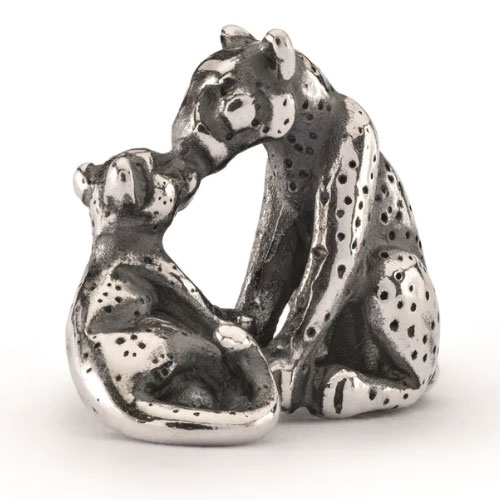 A leopard mom and her cub cast in sterling silver. Their faces meet in a sweet embrace and their tails curl about their dotted bodies in a joyous motion.