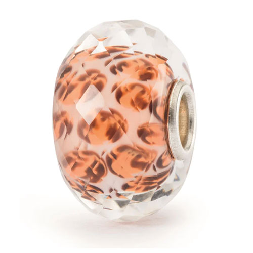 Bold yellow and brown dots adorn this facetted glass bead. Reminiscent of leopard spots, they lie on shades of white, warm grey and slight pink.